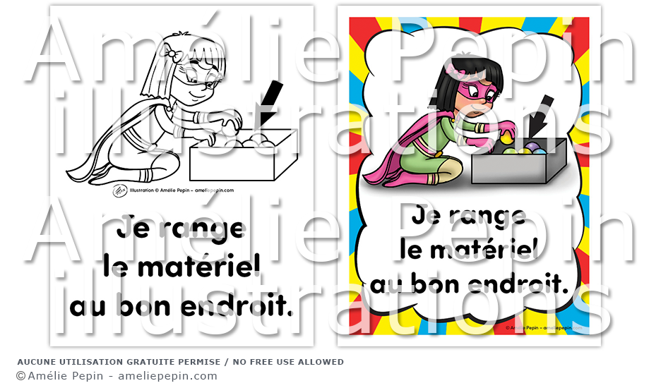 Règle de classe illustrée avec des superhéros: "Je range le matériel au bon endroit."