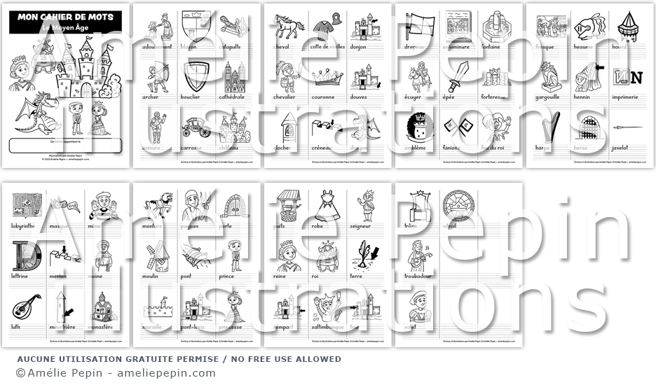 Utilisez ce document en tant que recueil de mots illustrés (dictionnaire) ou comme cahier d'écriture de mots sur le thème des châteaux (Moyen Âge). Les enfants peuvent colorier les dessins. Quatre versions sont incluses: sans lignes (rectangles pour écrire), avec lignes trottoirs, lignes doubles ou lignes calligraphiques.