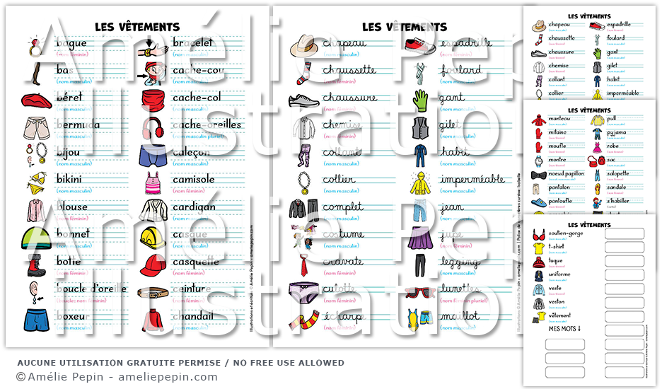 Les mots illustrés sont: bague, bas, béret, bermuda, bijou, bikini, blouse, bonnet, botte, boucle d'oreille, boxeur, bracelet, cache-cou, cache-oreilles, caleçon, camisole, cardigan, casque, casquette, ceinture, chandail, chapeau, chaussette, chaussure, chemise, collant, collier, complet, costume, cravate, culotte, écharpe, espadrille, foulard, gant, gilet, habit, imperméable, jean, jupe, legging, lunettes, maillot, manteau, mitaine, moufle, montre, noeud papillon, pantalon, pantoufle, parapluie, peignoir, portefeuille, pull, pyjama, robe, sac, salopette, sandale, short, slip, soulier, sous-vêtement, soutien-gorge, toge, toque, t-shirt, tuque, uniforme, veste, veston, vêtement, s'habiller, porter.