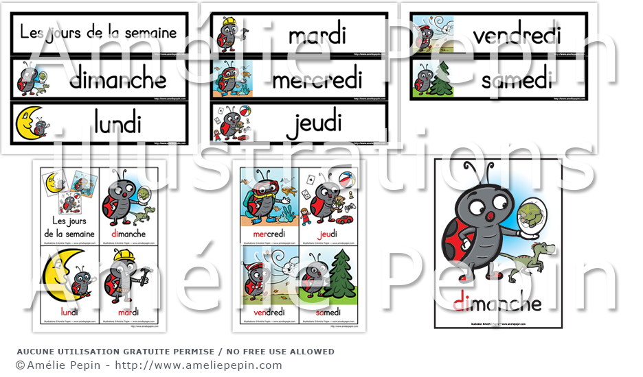Chaque jour de la semaine est représenté par une coccinelle avec un élément dont le son débute par la première syllabe du jour (DImanche, DInosaure).