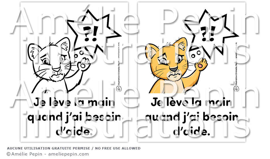 Règle de classe illustrée avec un lionceau: "Je lève la main quand j'ai besoin d'aide."