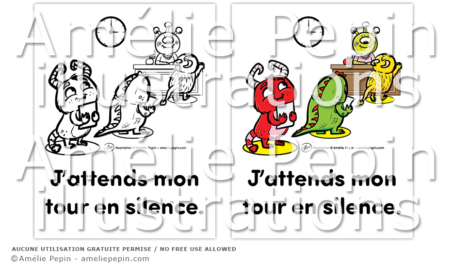Règle de classe illustrée avec un monstre: "J'attends mon tour en silence."