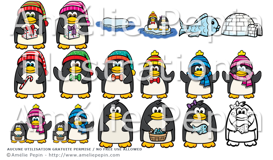 Le dossier contient des manchots filles et garçons, une banquise, un poisson et un igloo.