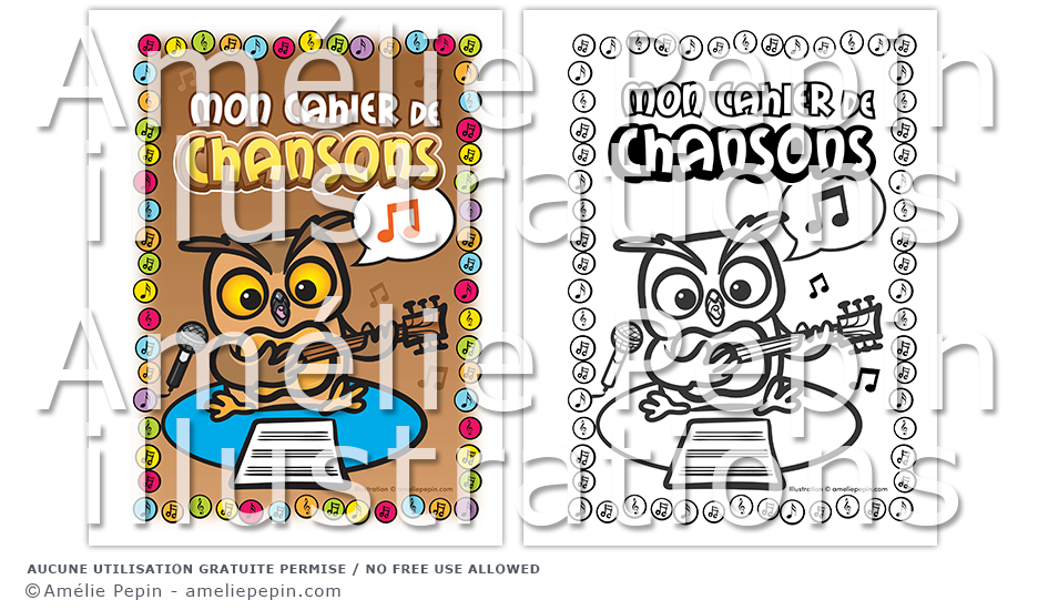 Voici une page couverture illustrée avec un hibou qui chante en jouant de la guitare pour votre cahier de chansons. Une marge a été prévue à gauche pour l'insertion dans un Duo-Tang. Une version en noir et blanc à colorier est incluse.
