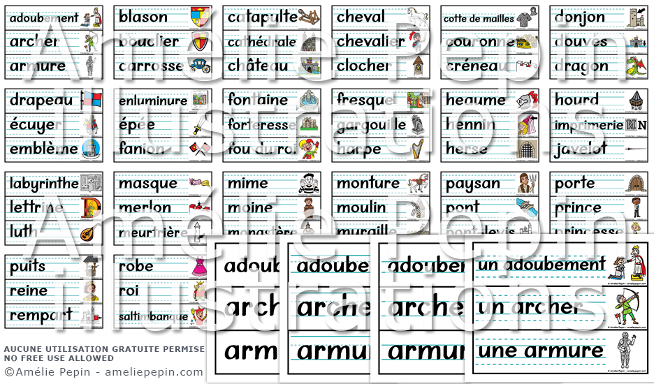 Les mots illustrés sont: adoubement, archer, armure, blason, bouclier, carrosse, catapulte, cathédrale, château, cheval, chevalier, clocher, cotte de mailles, couronne, créneau, donjon, douves, dragon, drapeau, écuyer, emblème, enluminure, épée, fanion, fontaine, forteresse, fou du roi, fresque, gargouille, harpe, heaume, hennin, herse, hourd, imprimerie, javelot, labyrinthe, lettrine, luth, masque, merlon, meurtrière, mime, moine, monastère, monture, moulin, muraille, paysan, pont, pont-levis, porte, prince, princesse, puits, reine, rempart, robe, roi, saltimbanque, seigneur, terre, tour, trône, troubadour, valet, vitrail.
