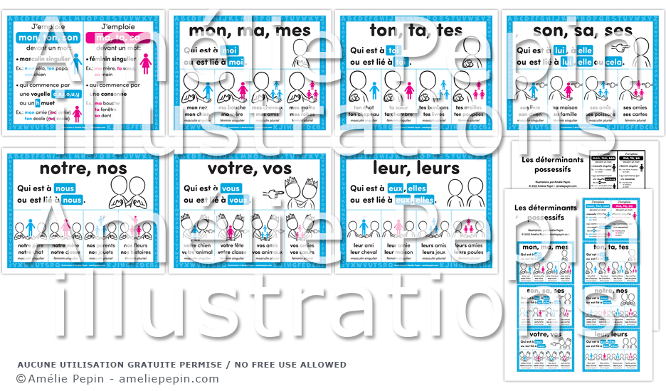 Sept affiches en couleurs qui illustrent l'emploi des déterminants possessifs (mon, ma, mes, ton, ta, tes, son, sa, ses, notre, nos, votre, vos, leur, leurs). Un aide-mémoire en couleurs et en noir et blanc est inclus pour les élèves.