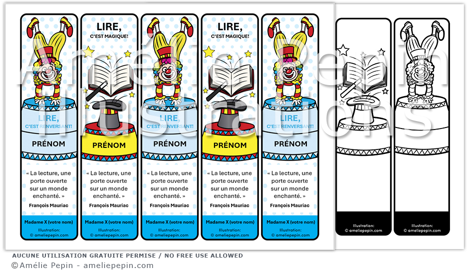 Signets aux coins arrondis illustrés soit avec un clown, ou avec un chapeau de magicien, une baguette magique et un livre ayant pour thème le cirque. Les textes suggérés que vous pouvez changer sur les signets sont: «Lire, c'est renversant!» pour le clown et «Lire, c'est magique» pour le chapeau. La citation pour les deux versions est: «La lecture, une porte ouverte sur un monde enchanté» de François Mauriac.