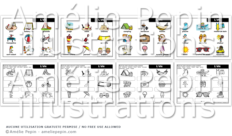 Imagier sur le thème de l'été. Le dossier contient 4 affiches et 4 feuilles d'activités pour apprendre le vocabulaire sur l'été. Dans les activités, l'enfant écrit les mots demandés au bon endroit.
