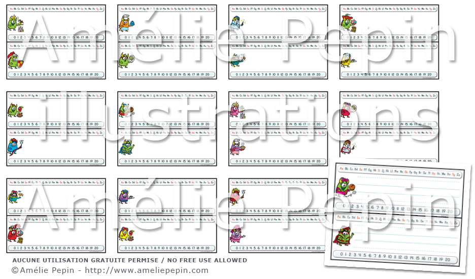 Tags: 1re année, 2e année, Anglais, Français, Préscolaire et maternelle, Personnages, Monstre, Étiquettes pour pupitres