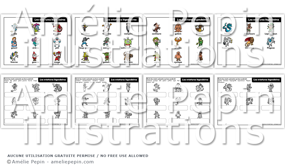 Imagier sur le thème des créatures légendaires. Le dossier contient 4 affiches et 4 feuilles d'activités pour apprendre le vocabulaire en lien avec les créatures légendaires. Dans les activités, l'enfant écrit les mots demandés au bon endroit.
