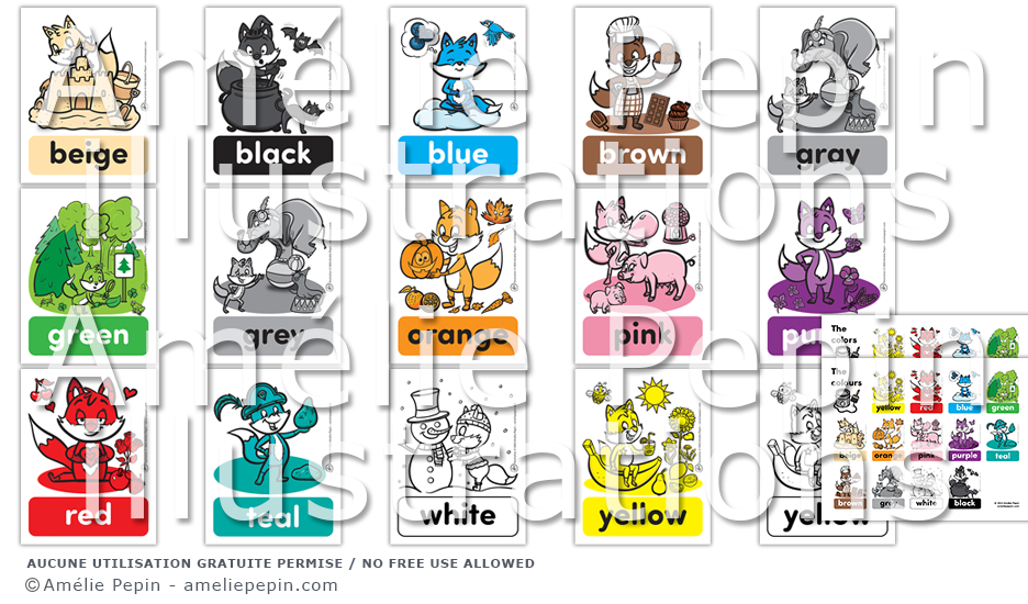 Sur chaque affiche, un renard est entouré d'éléments de la couleur désignée. Les couleurs sont: yellow, blue, red, green, orange, pink, purple, teal, brown, beige, gray (grey), black and white. Si vous séparez votre groupe en plusieurs équipes de couleurs différentes, vous pouvez utiliser ces affiches pour les identifier. Les illustrations représentent également certains thèmes, dont l'alimentation, la Saint-Valentin, l'été, l'automne, l'Halloween, l'hiver, les pirates, le cirque, la nature.
