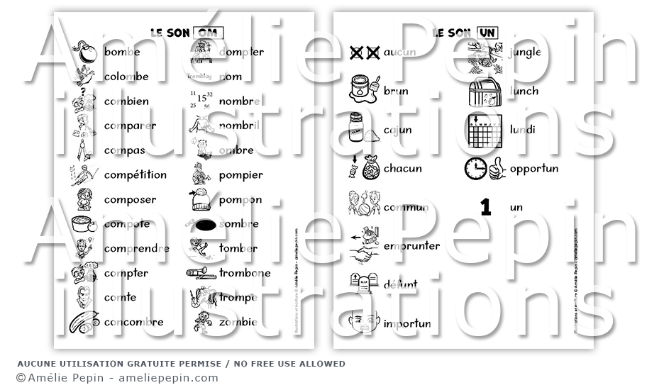 Ces documents comportent une liste de 37 mots illustrés en noir et blanc qui contiennent les sons OM et UN. L'élève peut surligner les sons dans chaque mot pour un meilleur apprentissage.