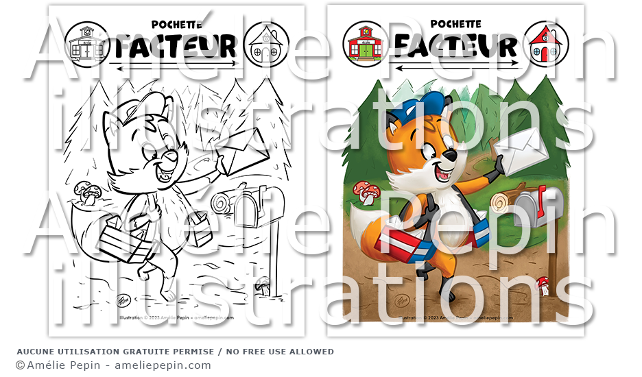 Couverture pour pochette facteur avec un renard. Une version à colorier est incluse.