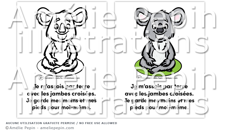 Règle de classe illustrée avec un koala: "Je m'assois par terre avec les jambes croisées. Je garde mes mains et mes pieds pour moi-même."