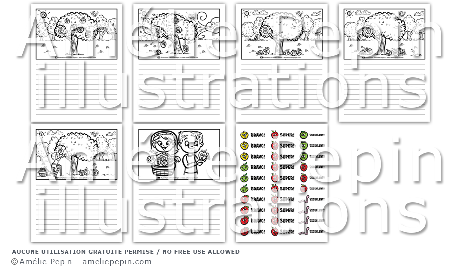 L'enfant compose son histoire en s'inspirant des images. Il peut inventer son titre et l'écrire sur la couverture avec son nom. Le document contient six images. Choisissez entre les lignes trottoirs, doubles ou simples.