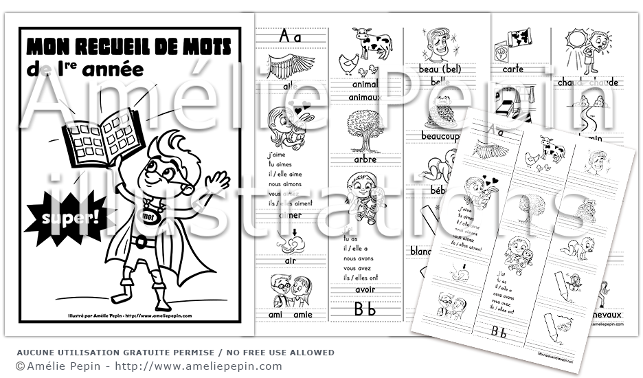 Utilisez ce document comme dictionnaire ou comme cahier d'écriture de mots de 1re année. Les mots illustrés sont ceux de la liste orthographique à l'usage des enseignantes et des enseignants rédigée par le ministère de l'Éducation du Québec (Mots à travailler en 1re année, p. 34 à 36. Version 2014). Sous chaque illustration, le mot y est inscrit sur une ligne trottoir.
