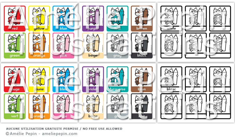 Les couleurs illustrées avec une grenouille qui tient un crayon sont: jaune, bleu, rouge, vert, orange, rose, violet, turquoise, brun, beige, gris, noir et blanc. Si vous séparez votre groupe en plusieurs équipes de couleurs différentes, vous pouvez utiliser ces affichettes pour les identifier. Chaque carte mesure environ 3 po X 3 1/2 po. La dernière page du document contient le blanc ainsi que 5 autres grenouilles à colorier (cela vous permet d'ajouter d'autres couleurs au besoin).