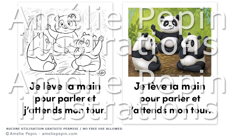 Règle de classe illustrée avec des pandas: "Je lève la main pour parler et j'attends mon tour."