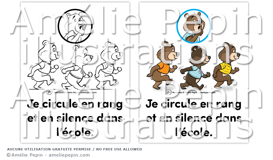 Règle de classe illustrée avec des ours: "Je circule en rang et en silence dans l'école."