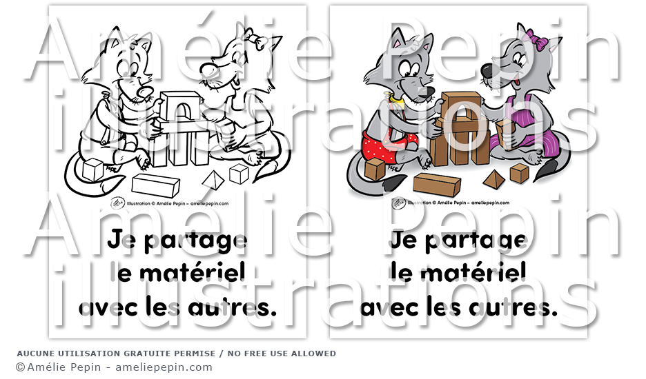 Règle de classe illustrée avec des loups: "Je partage le matériel avec les autres."