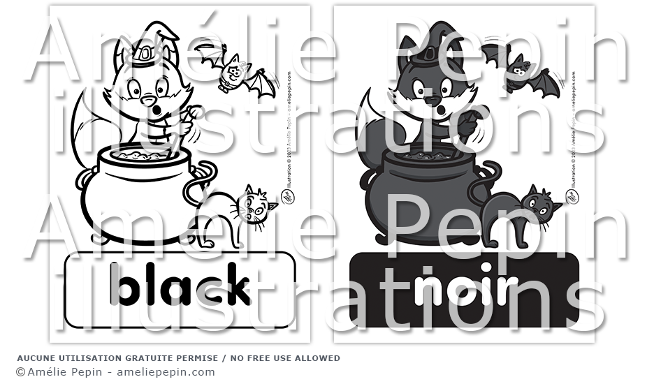 Sur cette affiche, un renard est entouré d'éléments de couleur noire: marmite, chat, chauve-souris. Une version à colorier de l'affiche est également incluse pour apprendre la couleur ou pour représenter le thème de l'Halloween.