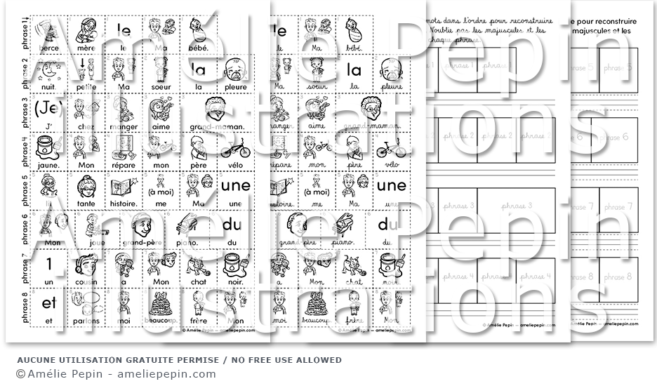 L'enfant découpe les mots illustrés de la page 3 du document (une rangée correspond à une phrase). Il replace les mots en ordre pour former une phrase et il les colle dans les carrés aux pages 1 et 2. Il peut ensuite écrire les phrases obtenues dans les trottoirs (écriture script) ou dans les lignes doubles (écriture cursive). Dans chaque phrase, la lettre majuscule et le point sont indiqués sur les images afin d'aider l'enfant. Les phrases contiennent de 5 à 6 mots.
