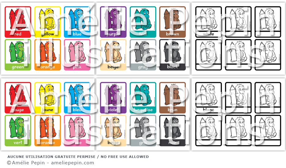 Les couleurs illustrées avec un singe qui tient un crayon sont: jaune, bleu, rouge, vert, orange, rose, violet, turquoise, brun, beige, gris, noir et blanc. Si vous séparez votre groupe en plusieurs équipes de couleurs différentes, vous pouvez utiliser ces affichettes pour les identifier. Chaque carte mesure environ 3 po X 3 1/2 po. La dernière page du document contient le blanc ainsi que 5 singes à colorier (cela vous permet d'ajouter d'autres couleurs au besoin).