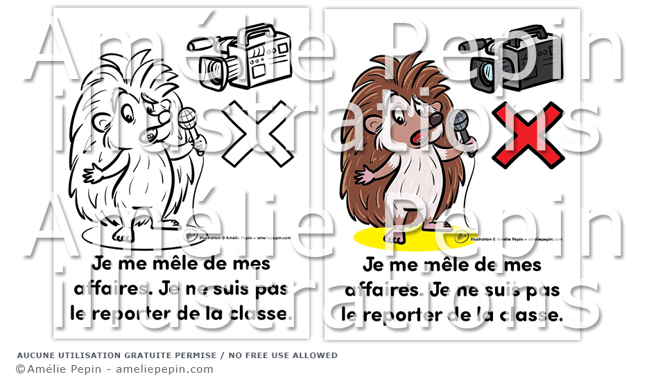 Règle de classe illustrée avec un hérisson: "Je me mêle de mes affaires. Je ne suis pas le reporter de la classe."