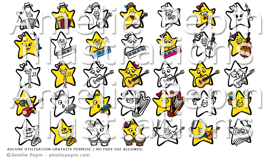 Ce dossier contient des images d'étoiles joyeuses qui jouent des instruments de musique suivants: accordéon, banjo, chant, clarinette, clavier, contrebasse, flûte, guitare acoustique, guitare électrique, harmonica, harpe, maracas, saxophone, tam tam, violon et xylophone.