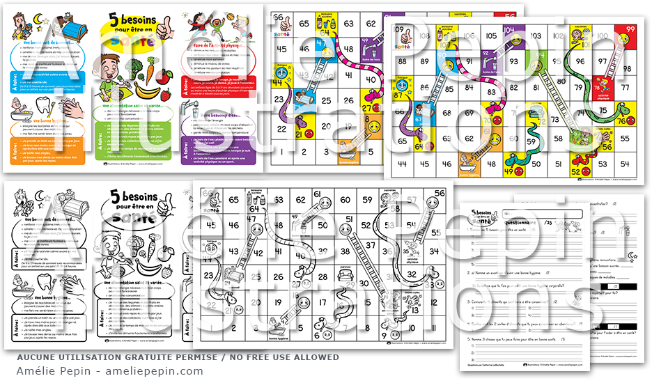 Au verso: un jeu de serpents et échelles. Les cinq besoins font monter l'enfant tandis que les cinq mauvaises habitudes le font descendre. Deux versions sont disponibles selon les difficultés à travailler (nombres de 1 à 66, nombres de 44 à 109).