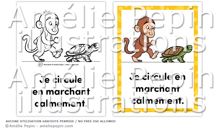 Règle de classe illustrée avec un singe et une tortue: "Je circule en marchant calmement."