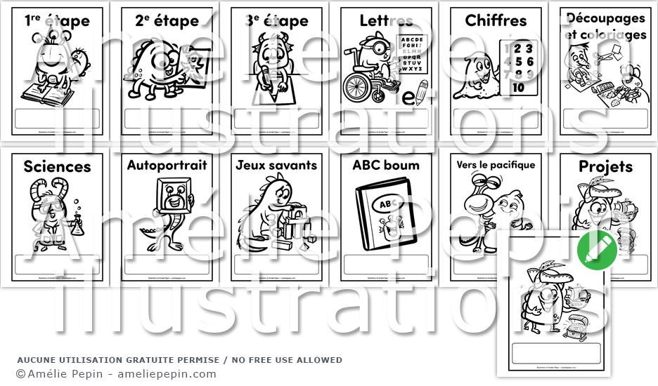 Voici 12 pages couvertures illustrées avec des monstres pour identifier les Duo-tangs ou les cahiers. Les titres écrits en français dans la version PDF sont: 1re étape, 2e étape, 3e étape, Autoportrait, Chiffres, Découpages et coloriages, Sciences, Lettres, Jeux savants, ABC boum, Vers le pacifique et Projets.