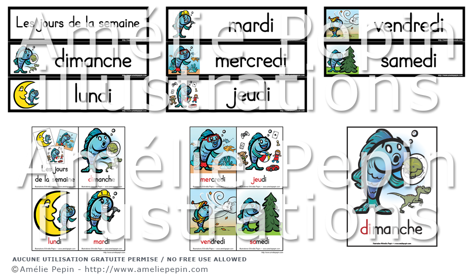 Chaque jour de la semaine est représenté par un poisson avec un élément dont le son débute par la première syllabe du jour (DImanche, DInosaure).