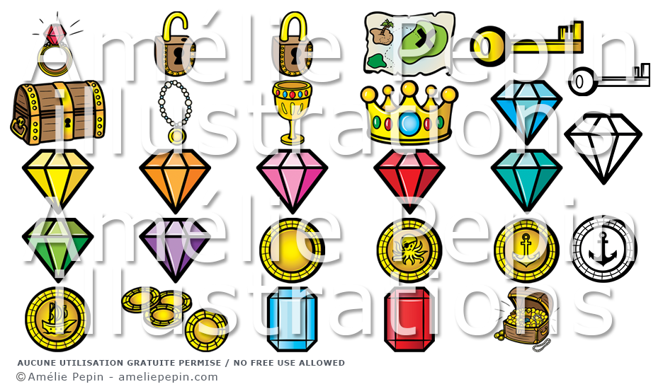 Ce dossier contient: une bague, un cadenas fermé, un cadenas ouvert, une clef, une carte, un coffre fermé, un collier, une coupe, une couronne, un diamant de différentes couleurs, différentes pièces d'or séparées, un groupe de pièces d'or, une pierre précieuse de différentes couleurs, un coffre au trésor ouvert.
