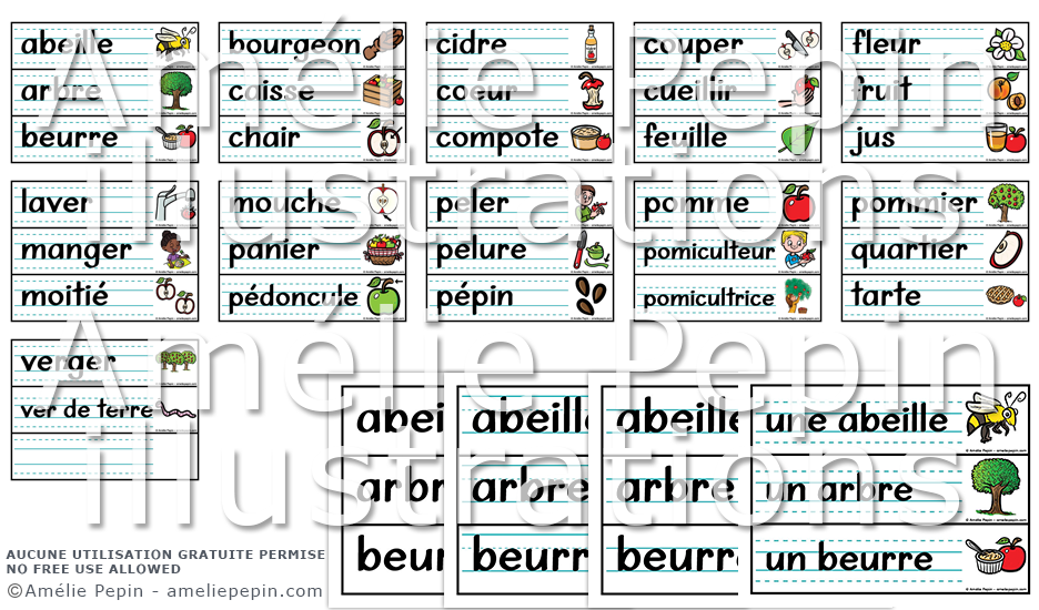 Les mots illustrés sont: abeille, arbre, beurre, bourgeon, caisse, chair, cidre, coeur, compote, couper, cueillir, feuille, fleur, fruit, jus, laver, manger, moitié, mouche, panier, pédoncule, peler, pelure, pépin, pomme, pomiculteur, pomicultrice, pommier, quartier, tarte, verger et ver de terre.