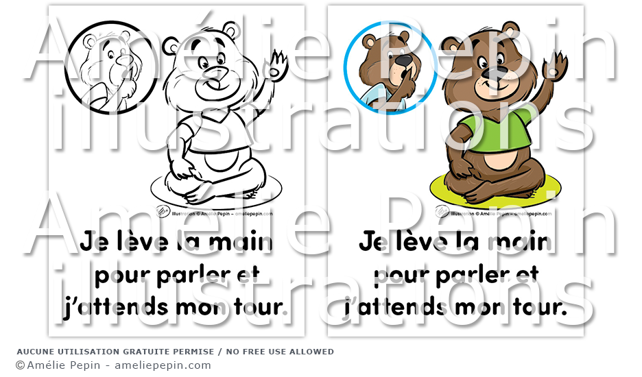 Règle de classe illustrée avec des ours: "Je lève la main pour parler et j'attends mon tour."