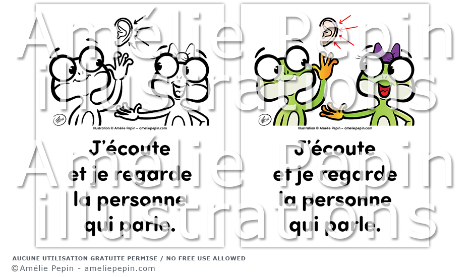 Règle de classe illustrée avec des grenouilles: "J'écoute et je regarde la personne qui parle."
