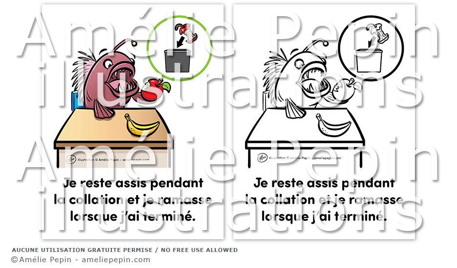 Règle de classe illustrée avec un poisson: "Je reste assis pendant la collation et je ramasse lorsque j'ai terminé."