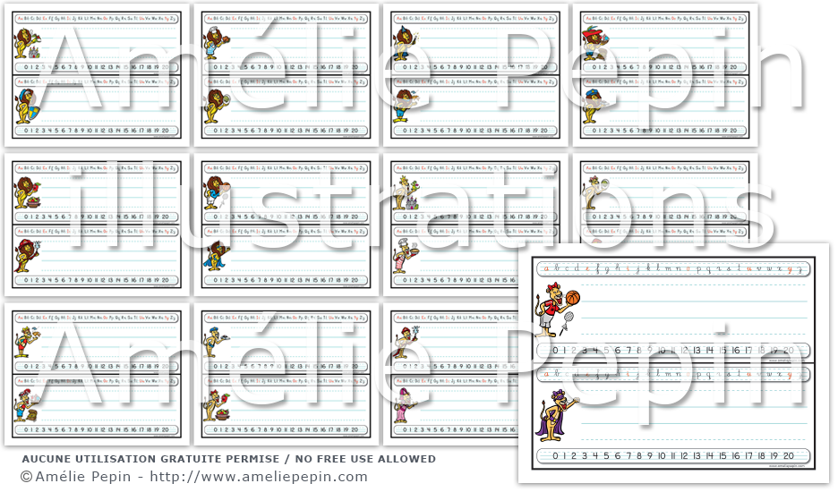 Chaque étiquette contient les lettres de l'alphabet en cursive avec les voyelles écrites en rouge, un trottoir pour écrire le prénom de l'enfant ainsi que les nombres de 0 à 20. La version PowerPoint vous permet d'écrire le nom de l'enfant à l'ordinateur (il n'y a pas de trottoir dans cette version). Assurez-vous d'avoir le logiciel Microsoft PowerPoint installé sur votre ordinateur pour ouvrir cette version.