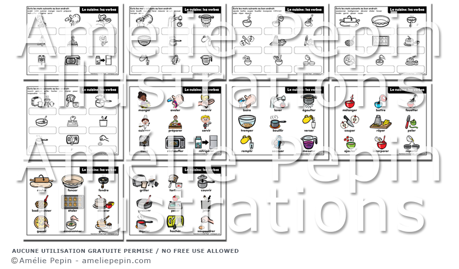 Voici quelques exemples de verbes illustrés: manger, boire, avaler, nourrir, cuisiner, préparer, servir, cuire, réchauffer, réfrigérer, couper, mesurer, laver, égoutter, bouillir, verser, mélanger, peler, peser, jeter, râper, décorer, etc.