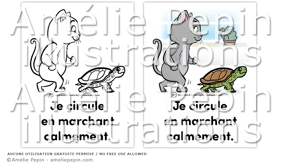 Règle de classe illustrée avec un chat et une tortue: "Je circule en marchant calmement."