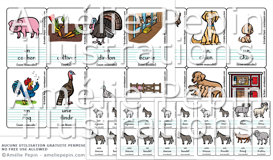 Les mots illustrés sont: agneau, ânesse, ânon, baudet, bélier, boeuf, bouc, brebis, brouette, campagne, canard, cane, caneton, champ, chat, chatte, chaton, cheval, chèvre, chevreau, chien, chienne, chiot, clapier, cochon, coq, cultiver, dinde, dindon, dindonneau, écurie, enclos, étable, ferme, fermier, fermière, foin, fourche, fumier, grange, jars, jument, laine, lait, lapereau, lapin, lapine, maïs, mare, mouton, oeuf, oie, oison, porcelet, porcherie, poulailler, poulain, poule, poulet, poussin, récolte, sac de grains, seau, silo, taureau, terre, tracteur, truie, vache, veau, âne, porc.