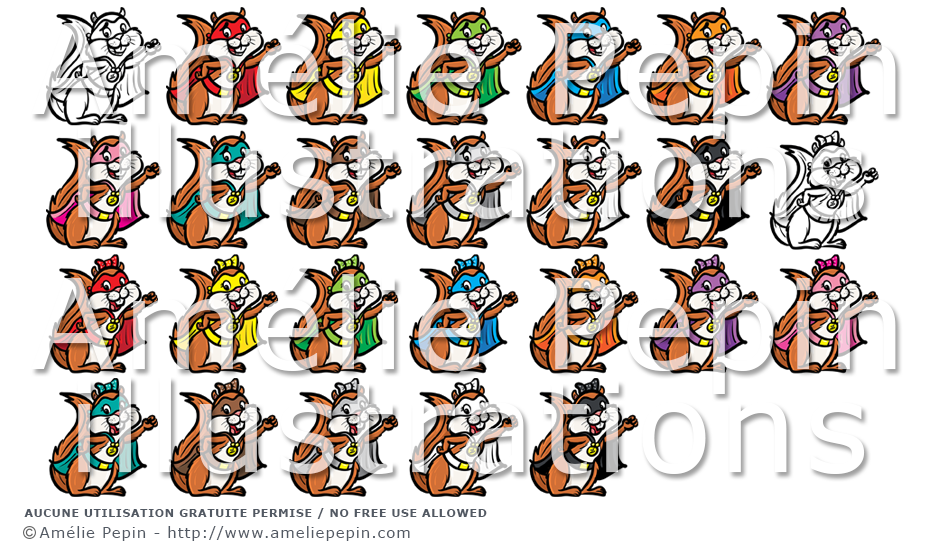 Ce dossier contient des images d'écureuils (garçons et filles) en superhéros de différentes couleurs: rouge, jaune, vert, bleu, orange, violet, rose, turquoise, brun, gris, noir et blanc.