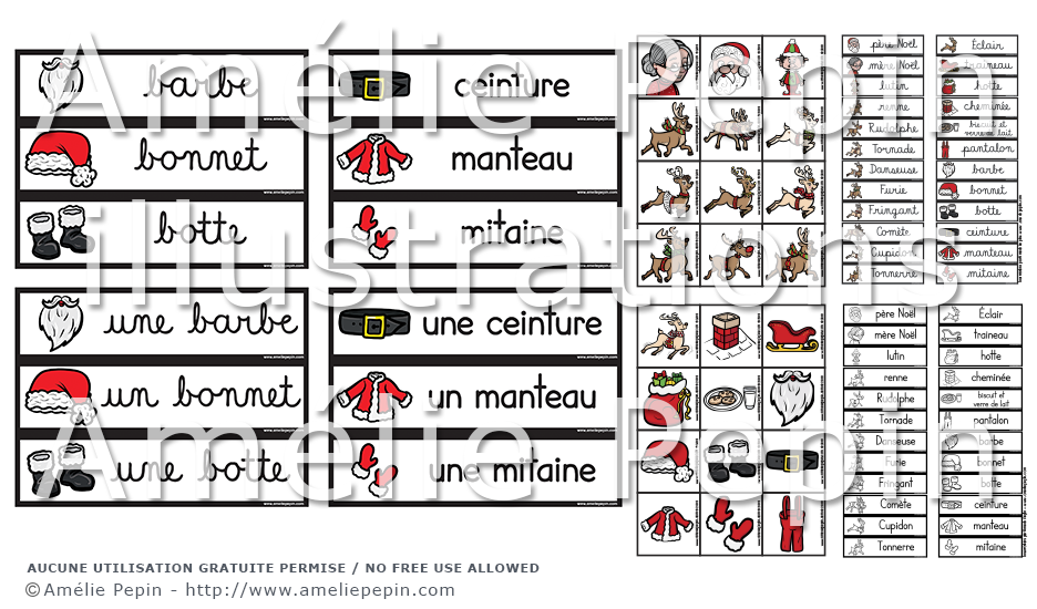 Les mots illustrés sont: père Noël, mère Noël, lutin, renne, Rudolph, Tornade, Danseuse, Furie, Fringant, Comète, Cupidon, Tonnerre, Éclair, traineau, hotte, cheminée, biscuit et verre de lait, pantalon, barbe, bonnet, botte, ceinture, manteau, mitaine.