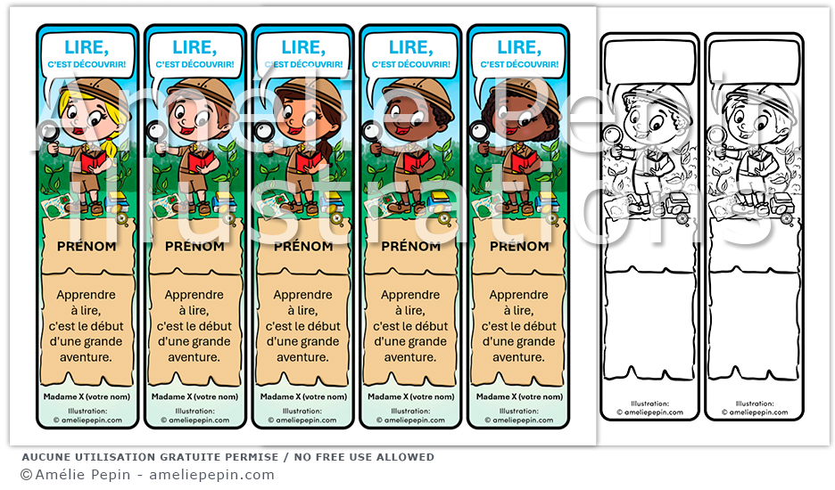 Signets aux coins arrondis illustrés avec des explorateurs (garçons et filles) ayant pour thème la découverte. Les textes suggérés que vous pouvez changer sur le signet sont: «Lire, c'est découvrir!», «Apprendre à lire, c'est le début d'une grande aventure».