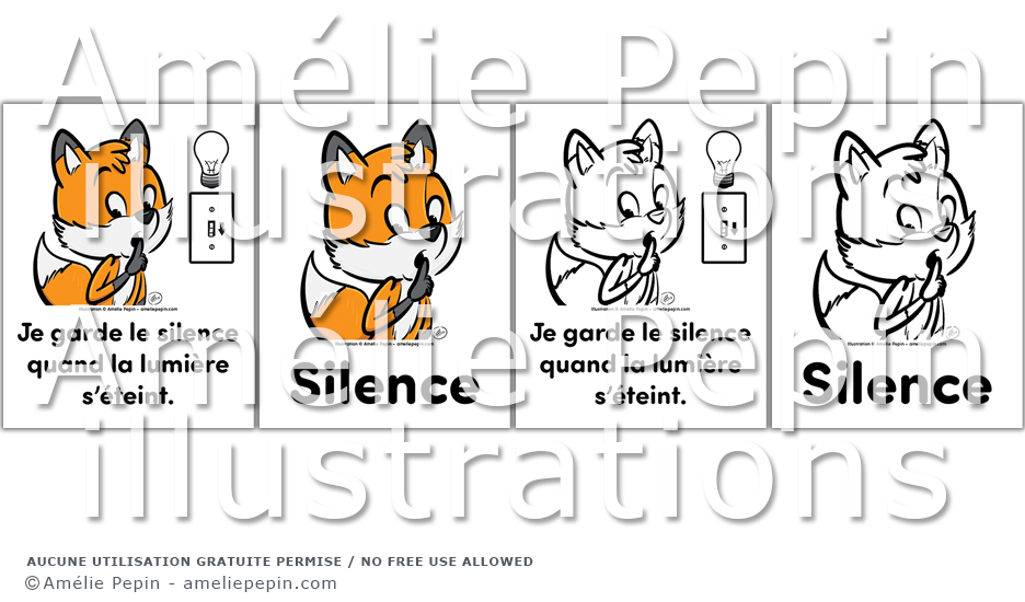 Règles de classe illustrées avec des renards: "Silence" et "Je garde le silence quand la lumière s'éteint."