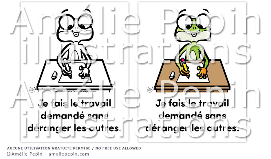 Règle de classe illustrée avec une grenouille: "Je fais le travail demandé sans déranger les autres."