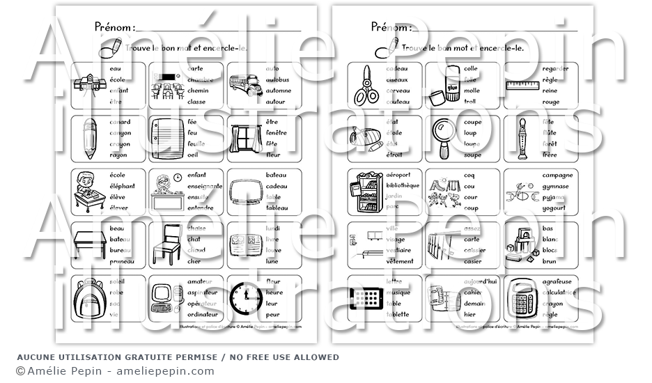 L'élève encercle le mot qui correspond à chaque image. Plusieurs mots se ressemblent, il devra lire les choix de réponse attentivement!