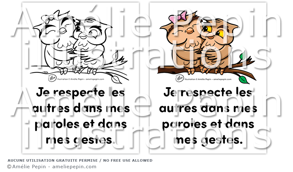 Règle de classe illustrée avec des hiboux: "Je respecte les autres dans mes paroles et dans mes gestes."
