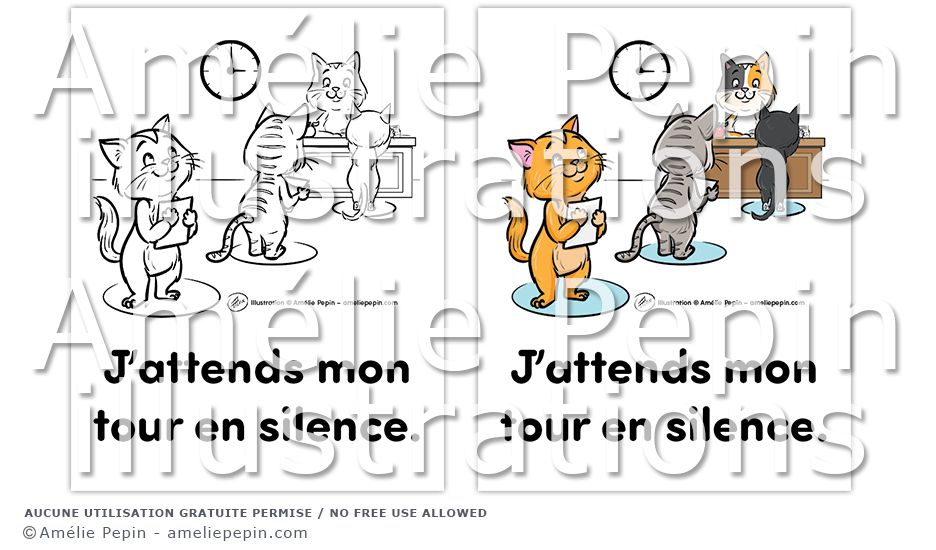 Règle de classe illustrée avec des chats: "J'attends mon tour en silence."